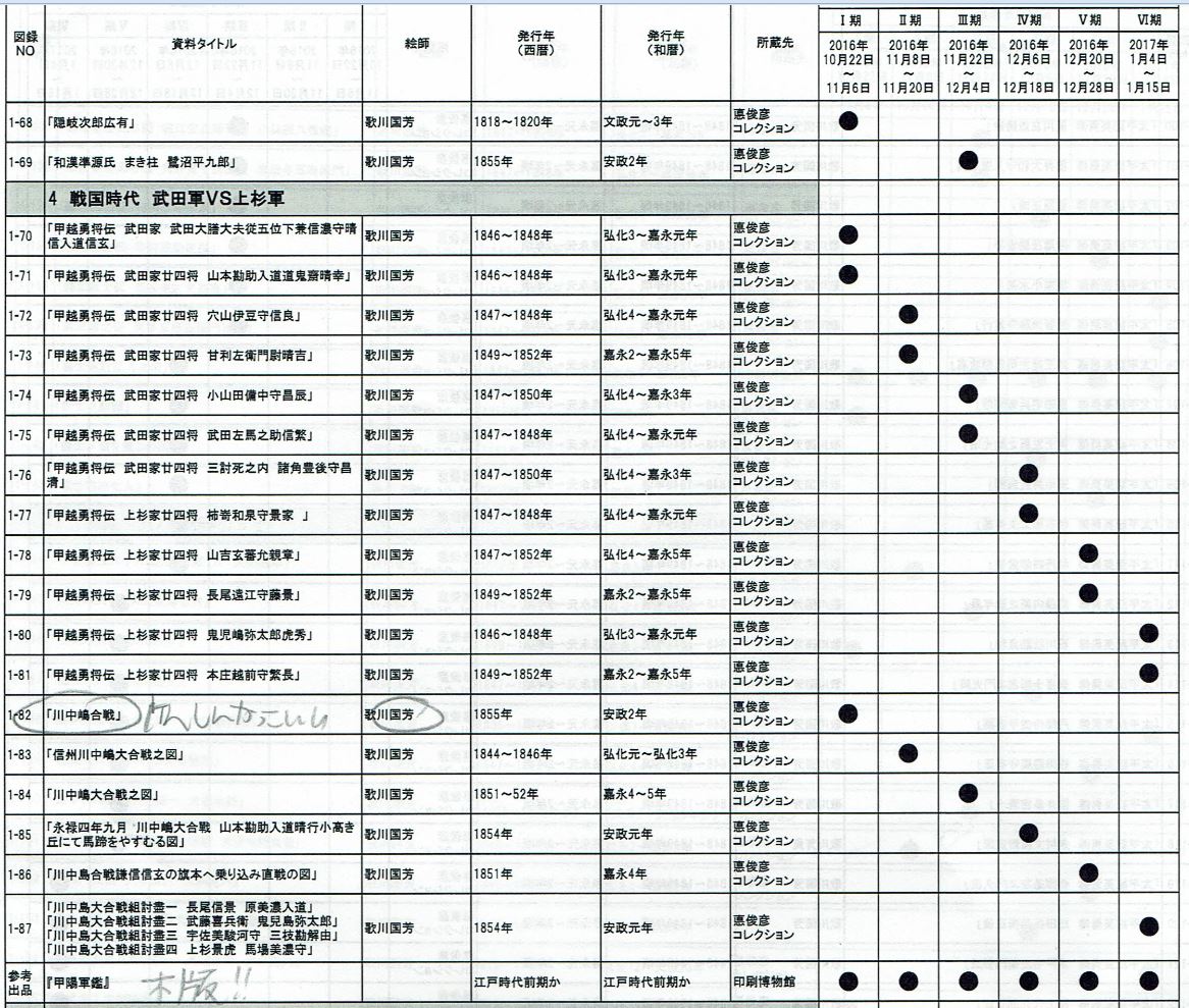 印刷博物館の企画展「武士と印刷」展に行ってきた(東京) 未分類 2016年11月14日 0 Edit ※2017年1月15日(日)まで開催しています! 先日印刷博物館の企画展「武士と印刷」展に行ってきました。 「描かれた昔の武士」と「それを発注した藩主・武将」について着眼している。 盛り沢山で浮世絵見るだけでしたらもっと早いかもだけど、 和とじ本も含めじっくり見たら2時間はオーバーする。 充実の展示、甲陽軍艦の本物もある。家康の銅製活字がすごい。 浮世絵の資料目録。 たとえば鬼小島弥太郎の浮世絵等、資料の保全の関係か期間限定のものが多い。 歴史クラスタが推し武将の絵に会えますように~ 里見八犬伝から水滸伝も展示してあり、大体が歌川国芳の中、 突然全くタッチがちがうのがあってすげえなんだコレ!?と表紙を良く見たら 「新編水滸画伝」「葛飾戴斗先生画」って書いてあってH O K U S A I !!てなった。 やっぱちがうぜ北斎…大好き/// 書籍と、それを発注した藩主、大名の展示目録。和綴じ本どっさり… 兼続が選んだ中国の詩を集めた『文選』という本の初版と重版も共に展示され、 その違いが罫線の有無であったりなど解説されている。 死後に奥さんのお船さん&上杉家が重版をかけたそうです。